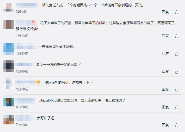 據悉,倒塌的是一棟6層的待拆遷樓房,事發前有居民居住,但是樓房出現異響后已經提前撤離。目前,應急管理部門,包括消防部門已經攜帶有毒氣體探測儀、生命探測儀等救援設施趕到現場,正在對樓體的結構安全進行評估,制定后續的處置措施。 深圳消防表示,消防接報后迅速出動處置,目前事故仍在處置中。 部分網友評論: